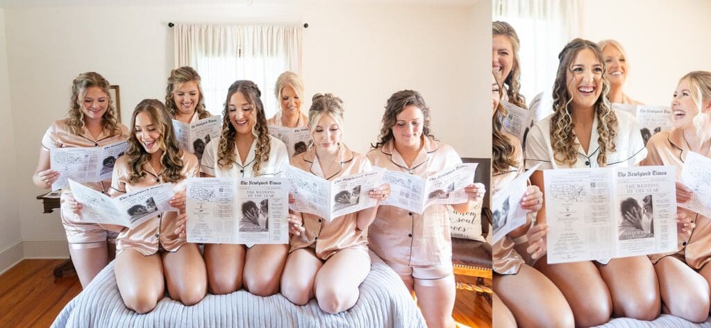 Bride and bridesmaids in bridal suite in matching getting ready pajamas