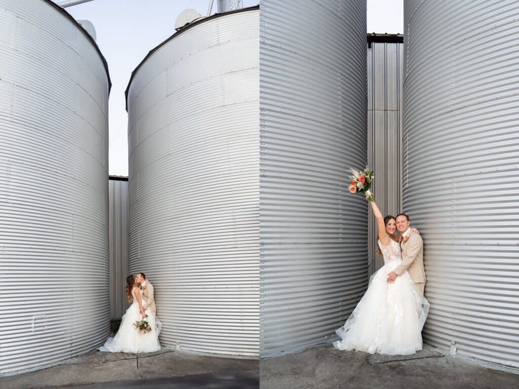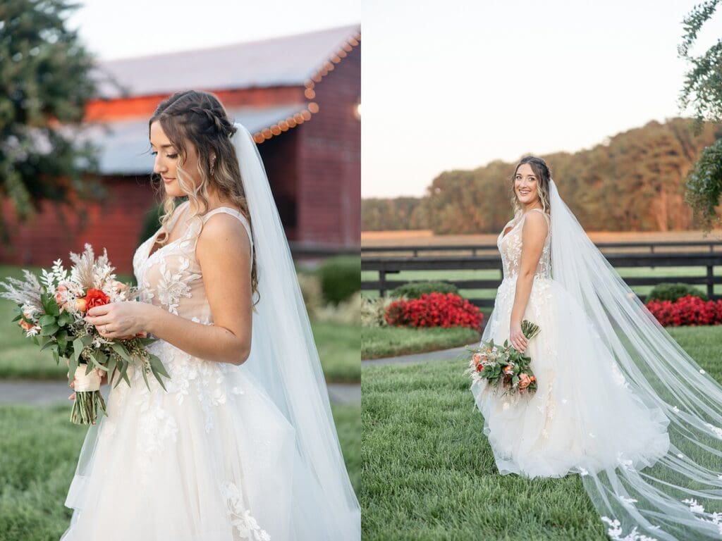 Romantic golden hour portraits with bride and groom by the barn