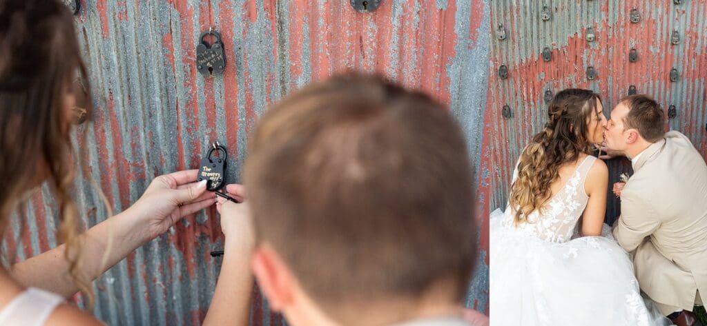 Bride and groom writing on lock to add to barn wall