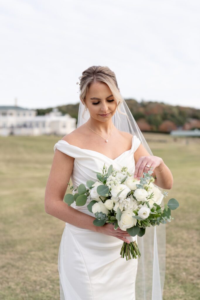 There’s no single most flattering bridal pose because every bride is different. That said, a few poses tend to work well for most brides: holding your bouquet just below your waist with your elbows slightly bent, angling your body at about 45 degrees to the camera, and looking slightly over your shoulder for a soft, elegant feel. For a more candid look, walk slowly, laugh freely, or look down at your dress to create beautiful, natural portraits. Your photographer will help you find the poses that feel and look the best.