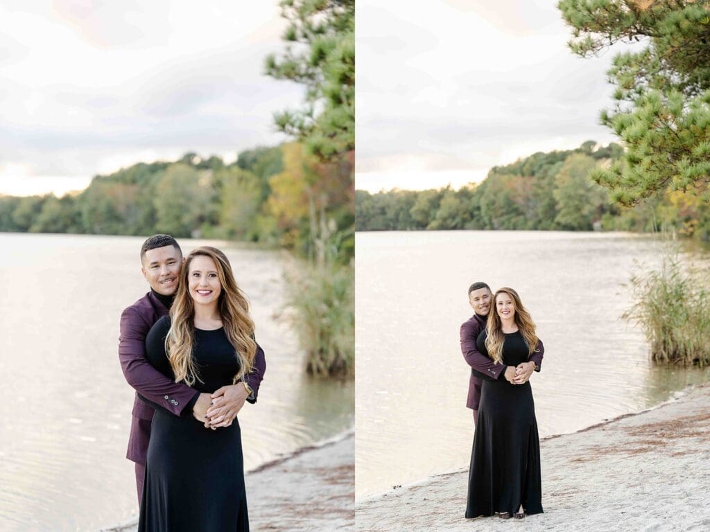 We started on a tree-lined path, with Kellie in a sleek black dress and Edwin in a deep purple suit that brought the elegant style to this session! They didn’t need to overdo it. Their chemistry, their ease with each other, and their thoughtful outfit choices did all the work. After a few portraits by the water, they changed into something more relaxed just as golden hour showed up and gave us the perfect glow through the trees.