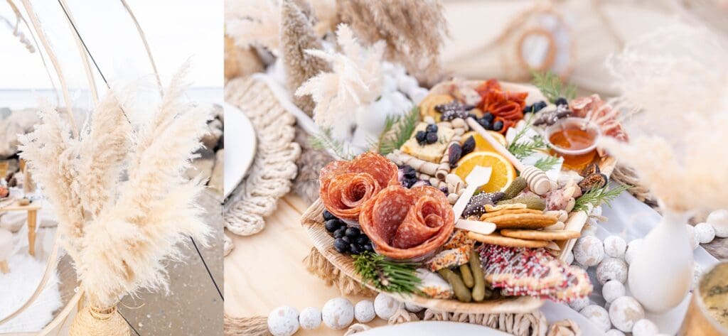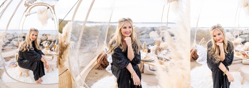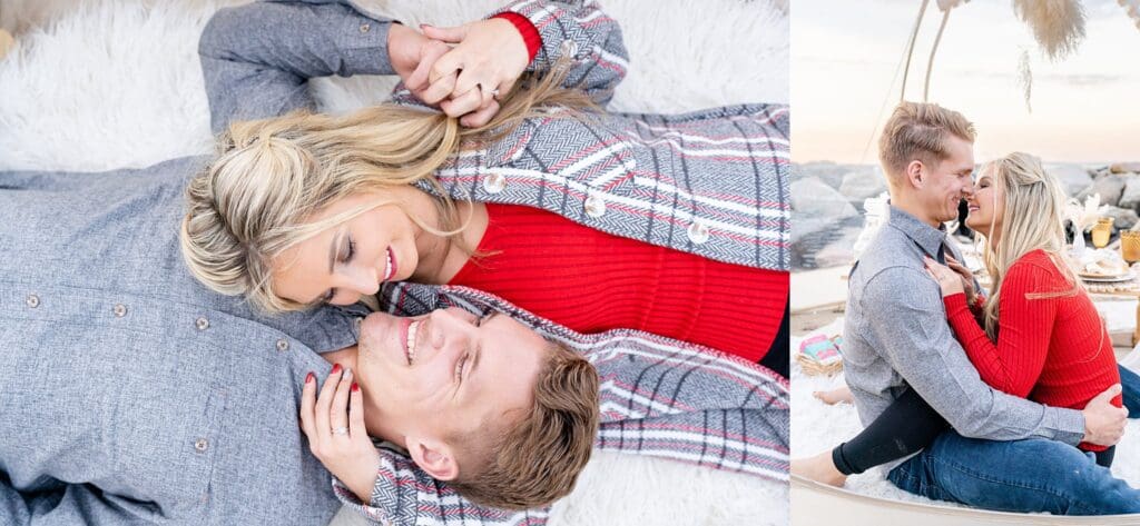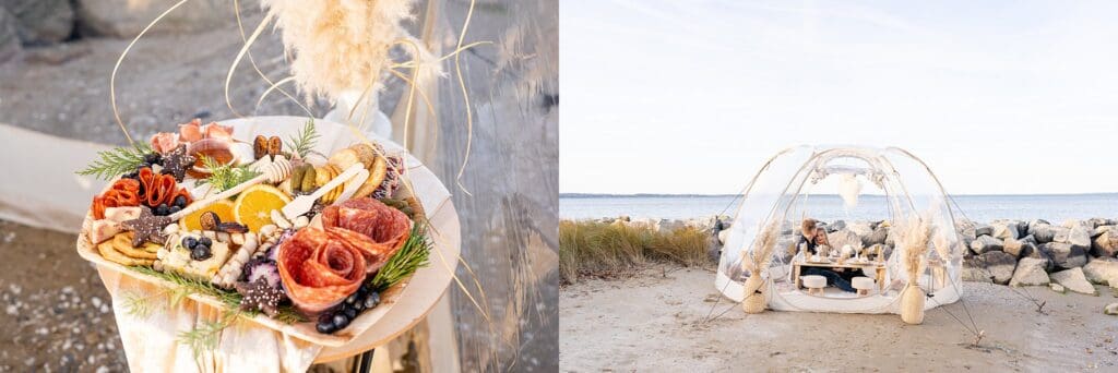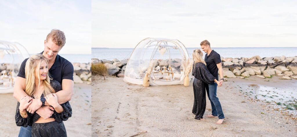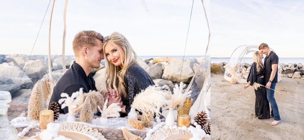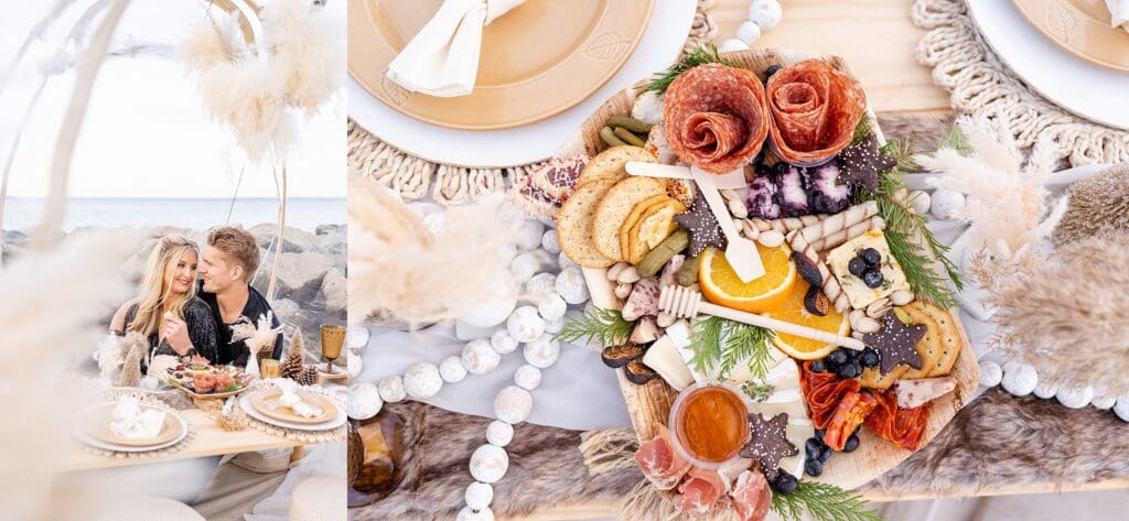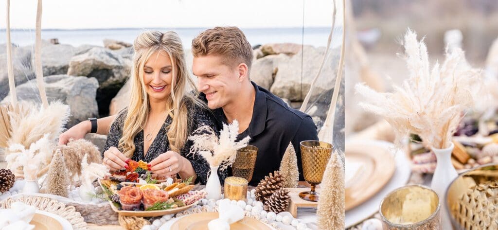 With the soft waves behind them and golden hour light pouring in, they laughed and shared sweet moments around a beautifully styled table (yes, including a charcuterie board!). Amber wore a shimmery black jumpsuit that caught the light perfectly, and Drew matched her vibe with his outfit.